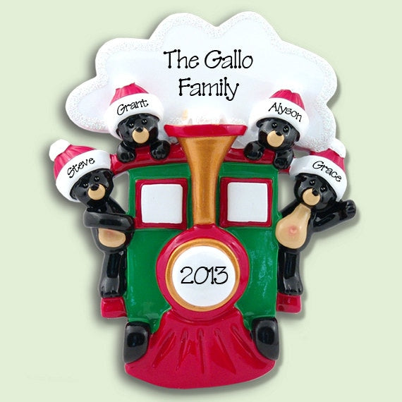 4 BLACK BEARS in Train Personalized Family Ornament - Hand Personalized Christmas Ornament