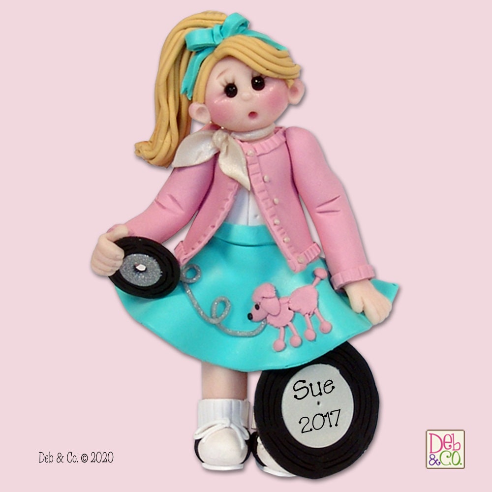 50's Girl in Poodle Skirt Handmade Polymer Clay Personalized Christmas Ornament, Poodle Skirt Ornament, Blonde in Custom Gift Box