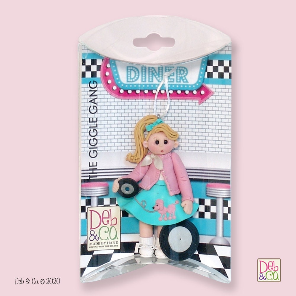 This adorable little Giggle Gang 50's Girl personalized ornament is ready for the "Sock Hop" Designed and handmade by me. Very detailed right down to the little poodle on the skirt. Comes complete with a hook and satin ribbon for hanging. It is packaged in a cute little custom pillow box.