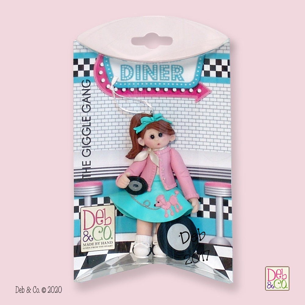 This adorable little Giggle Gang 50's Girl personalized ornament is ready for the "Sock Hop" Designed and handmade by me. Very detailed right down to the little poodle on the skirt. Comes complete with a hook and satin ribbon for hanging. It is packaged in a cute little custom pillow box.