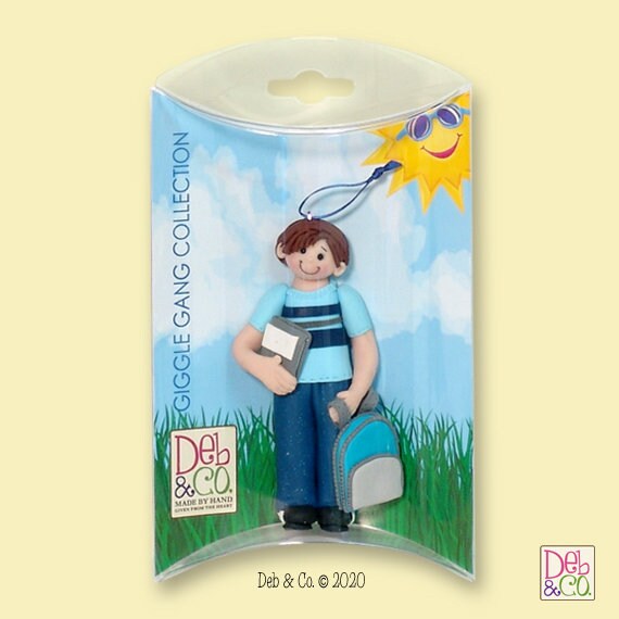 New from my "Giggle Gang Collection", this darling little boy Christmas ornament is part of my Limited Edition Collection and there are just a few available. He is ready for his 1st day of school with his books and back back.