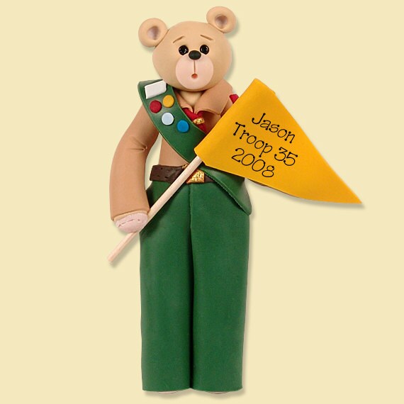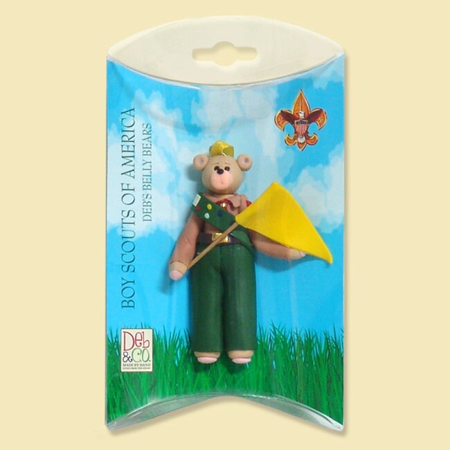 This is a darling little Belly Bear dressed up as a Boy Scout. He is extremely detailed. He may be easily personalized on the pennant with a name and the year. Handmade from polymer clay and designed by me. Comes complete with a hook and satin ribbon for hanging and is packaged in this cute little custom pillow box.