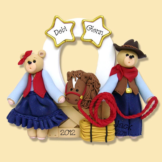 Belly Bear Cowboy Family of 2 / Couples with Horse HANDMADE POLYMER CLAY Personalized Christmas Ornament