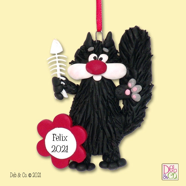 Black & White Crazy Tuxedo KITTY CAT w/ Fish HANDMADE Polymer Clay Personalized Christmas Ornament