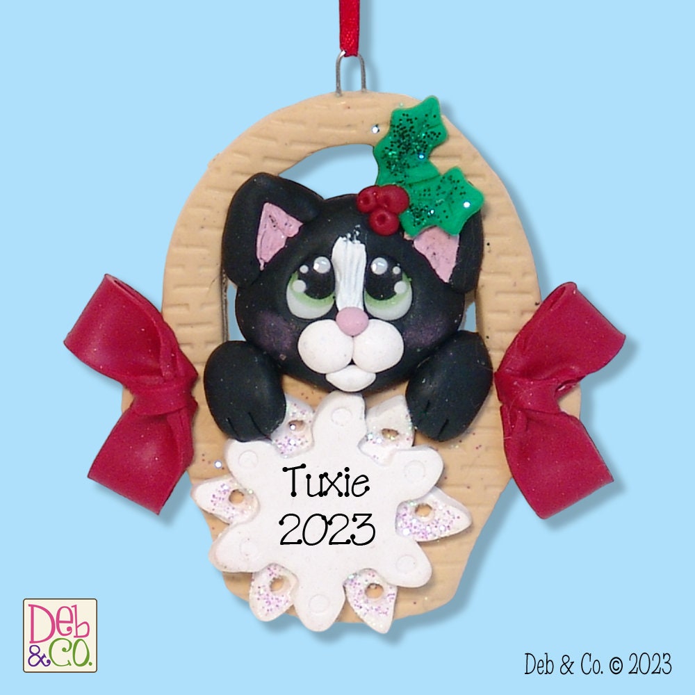 Black & White Tuxedo KITTY CAT in a Basket- Handmade Polymer Clay - Personalized Christmas Ornament - Limited Edition