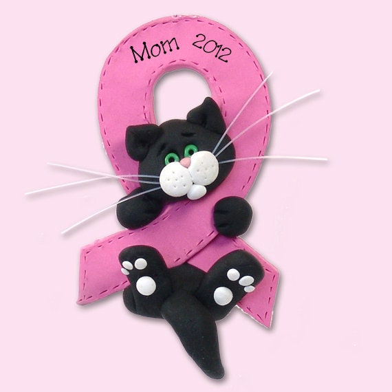 Breast CANCER-PINK RIBBON Survivor / Memorial Black & White Cat - Polymer Clay Personalized Christmas Ornament
