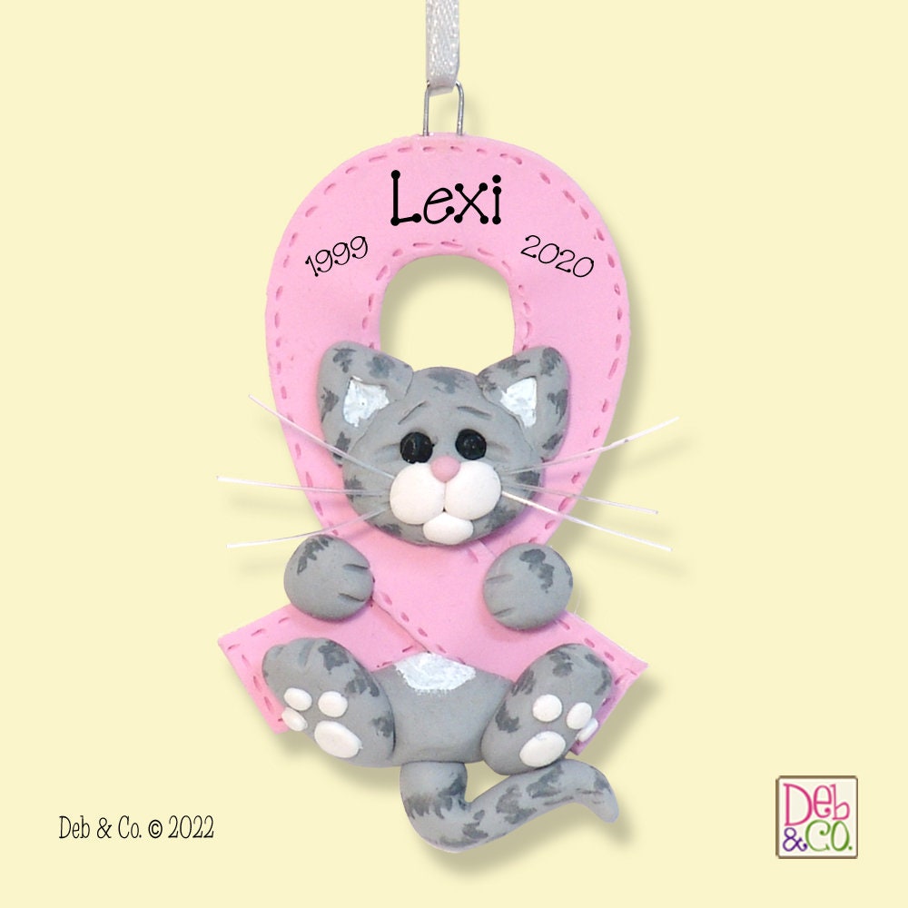 Breast CANCER-PINK RIBBON Survivor / Memorial Gray Tabby Kitty Cat - Polymer Clay Personalized Christmas Ornament