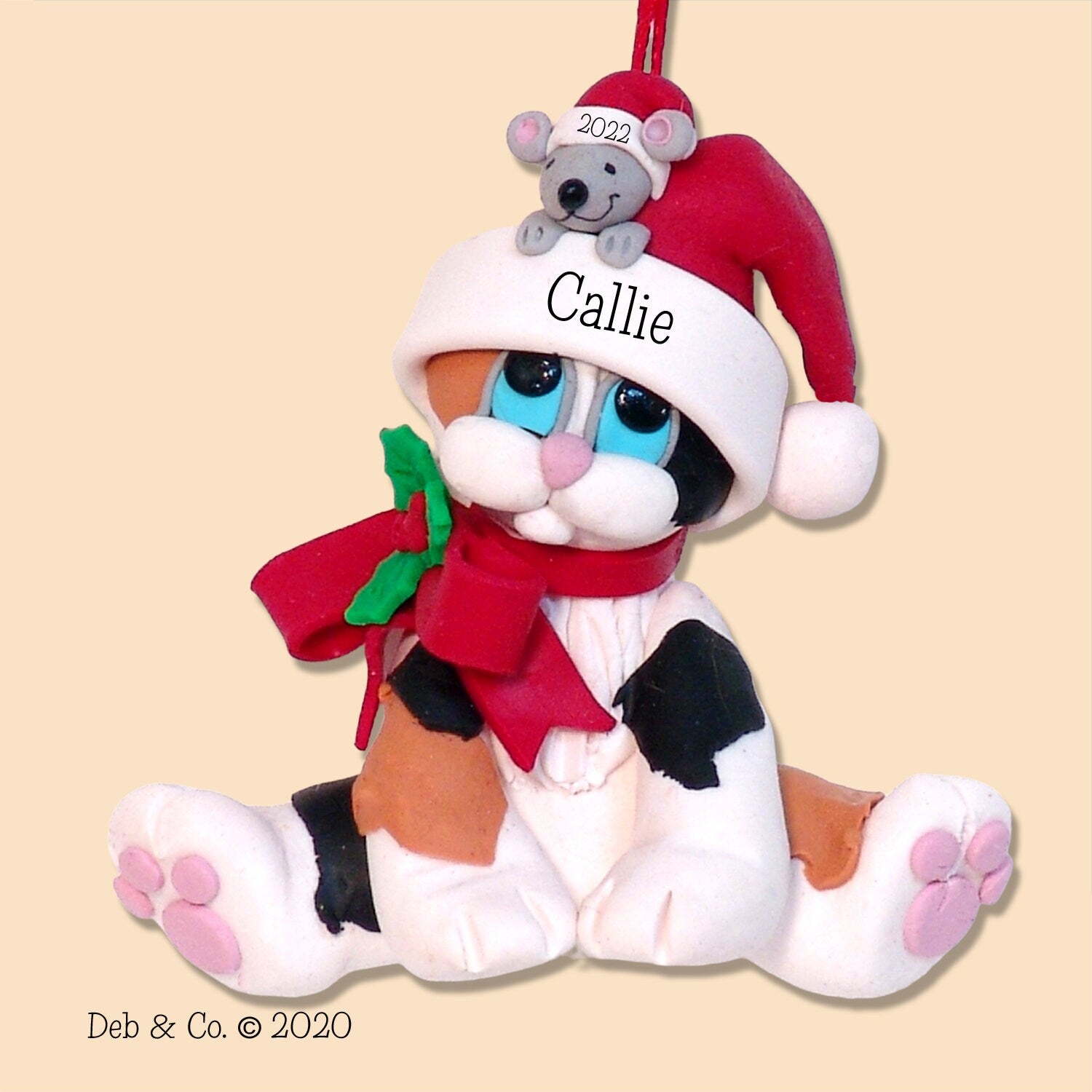Calico KITTY CAT with Mouse HANDMADE Polymer Clay Personalized Christmas Ornament - Limited Edition