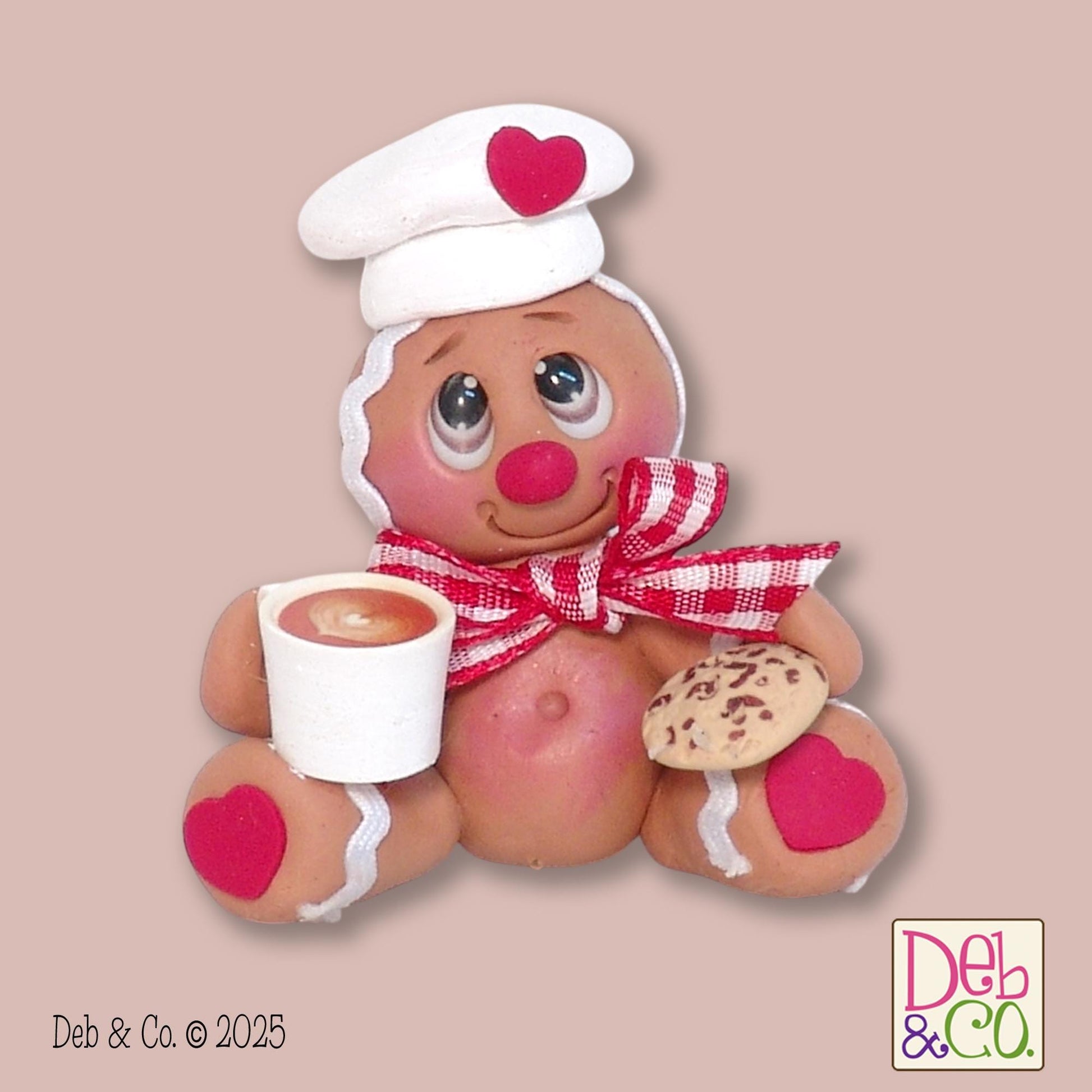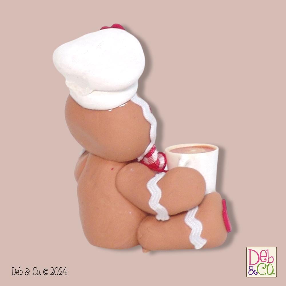 This is a darling little gingerbread figurine drinking a cup of hot chocolate and eating a chocolate chip cookie. It is handmade from polymer clay by me. It is a 3-dimensional figurine and does NOT have a hook for hanging. Looks great sitting on a shelf or mantel or as a tiered tray decoration.