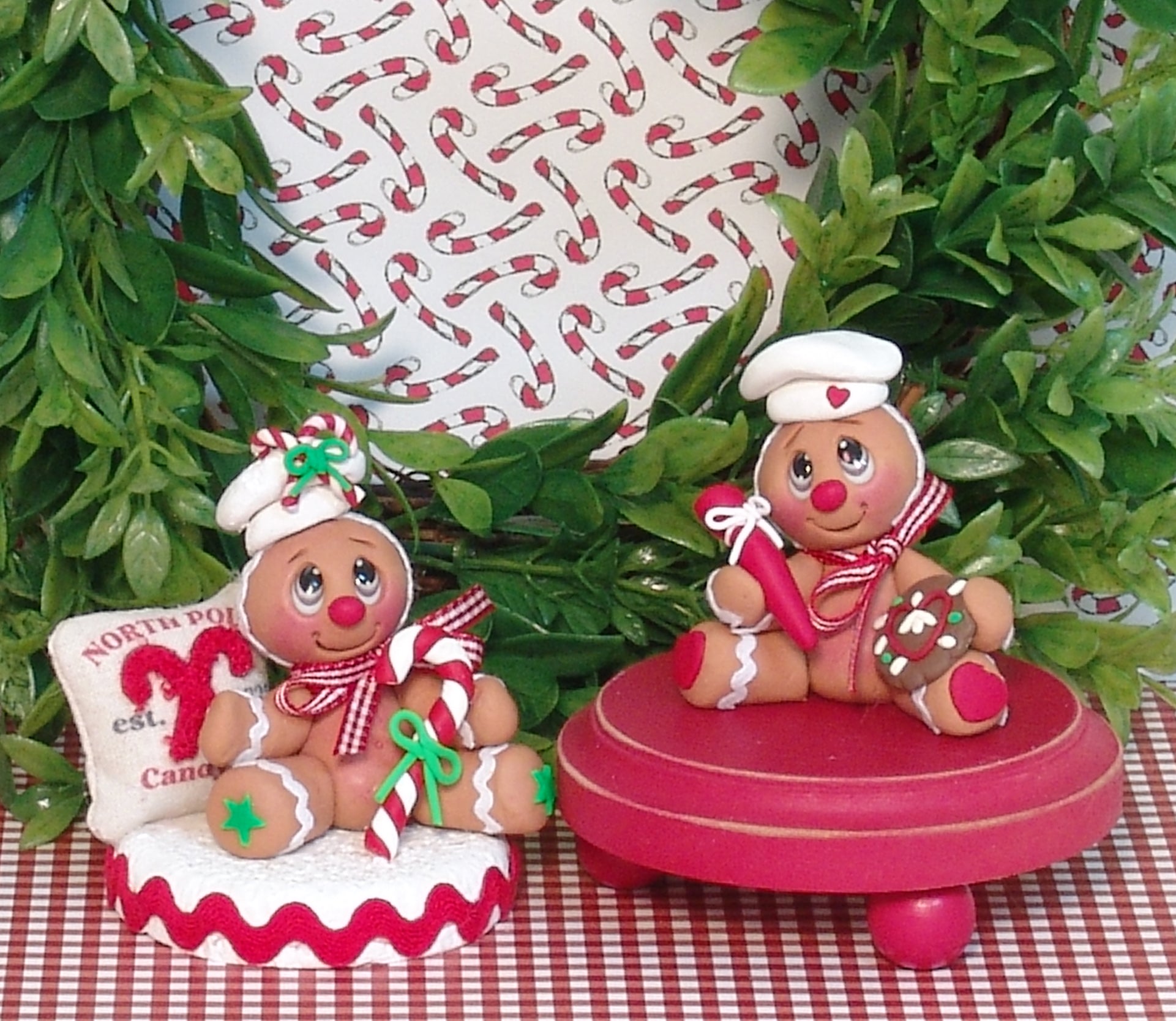 This is a darling little gingerbread figurine. He is sitting on a Polymer base holding a candy cane with a flour sack behind him. It is handmade from polymer clay. It is a 3-dimensional figurine and does NOT have a hook for hanging. It looks great sitting on a shelf or mantel or as a tiered tray decoration.