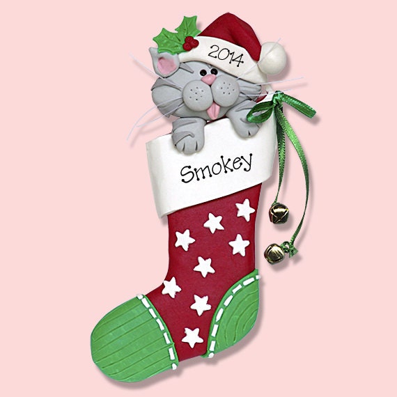 Gray Tabby Christmas KITTY CAT in Stocking HANDMADE Polymer Clay Personalized Christmas Ornament