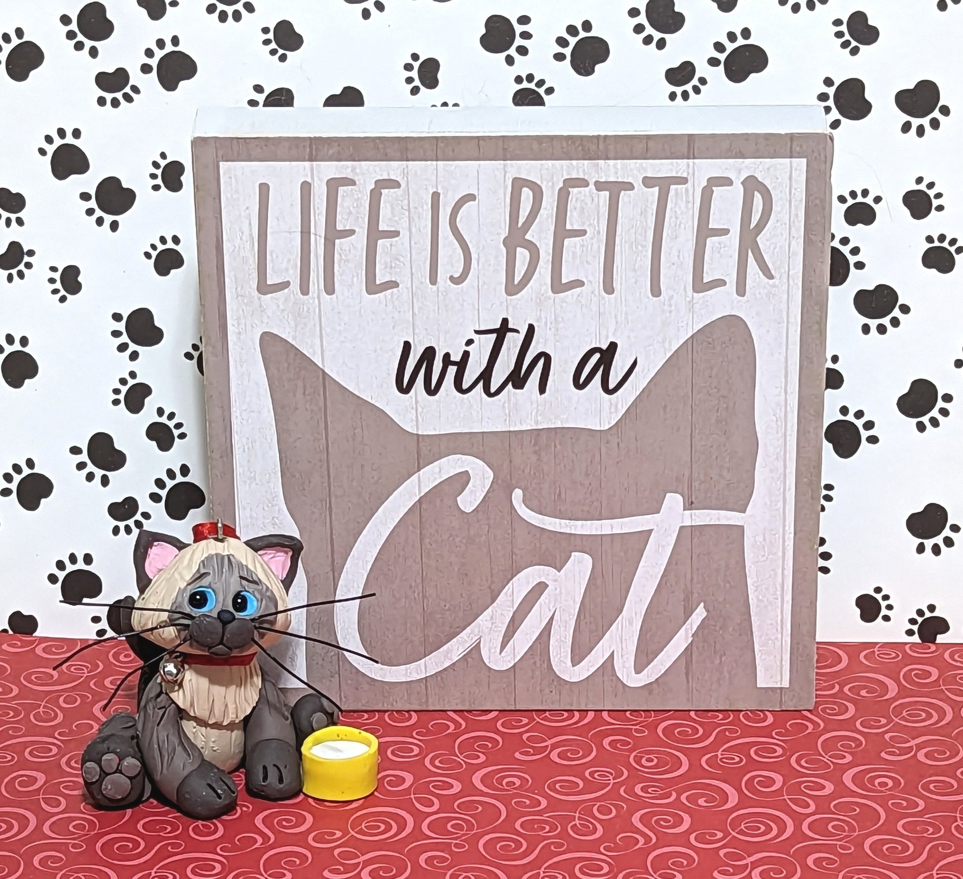 Himalayan / Siamese Cat with Plaque - "Life is Better with a Cat" 2 Piece Set / Handmade Valentine Decoration - Choose Your Kitty