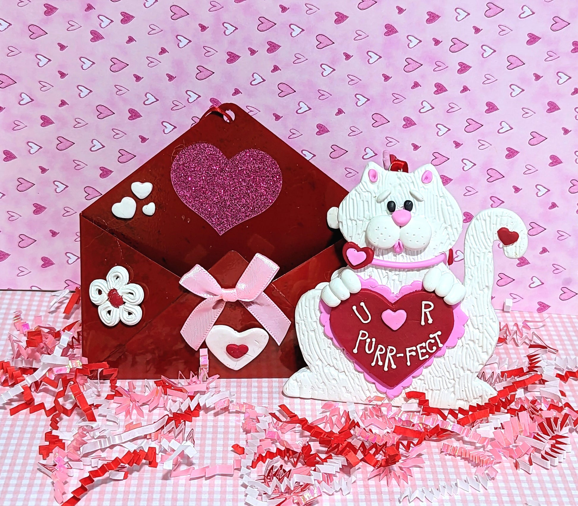 Kitty Cat "U R Purr-fect" Valentine Ornament Handmade Polymer Clay Sitting in Tin Envelope