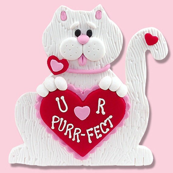 Designed by me and handmade from Polymer clay. It is very detailed. Even the words"U R Purr-fect" are handcrafted from clay.