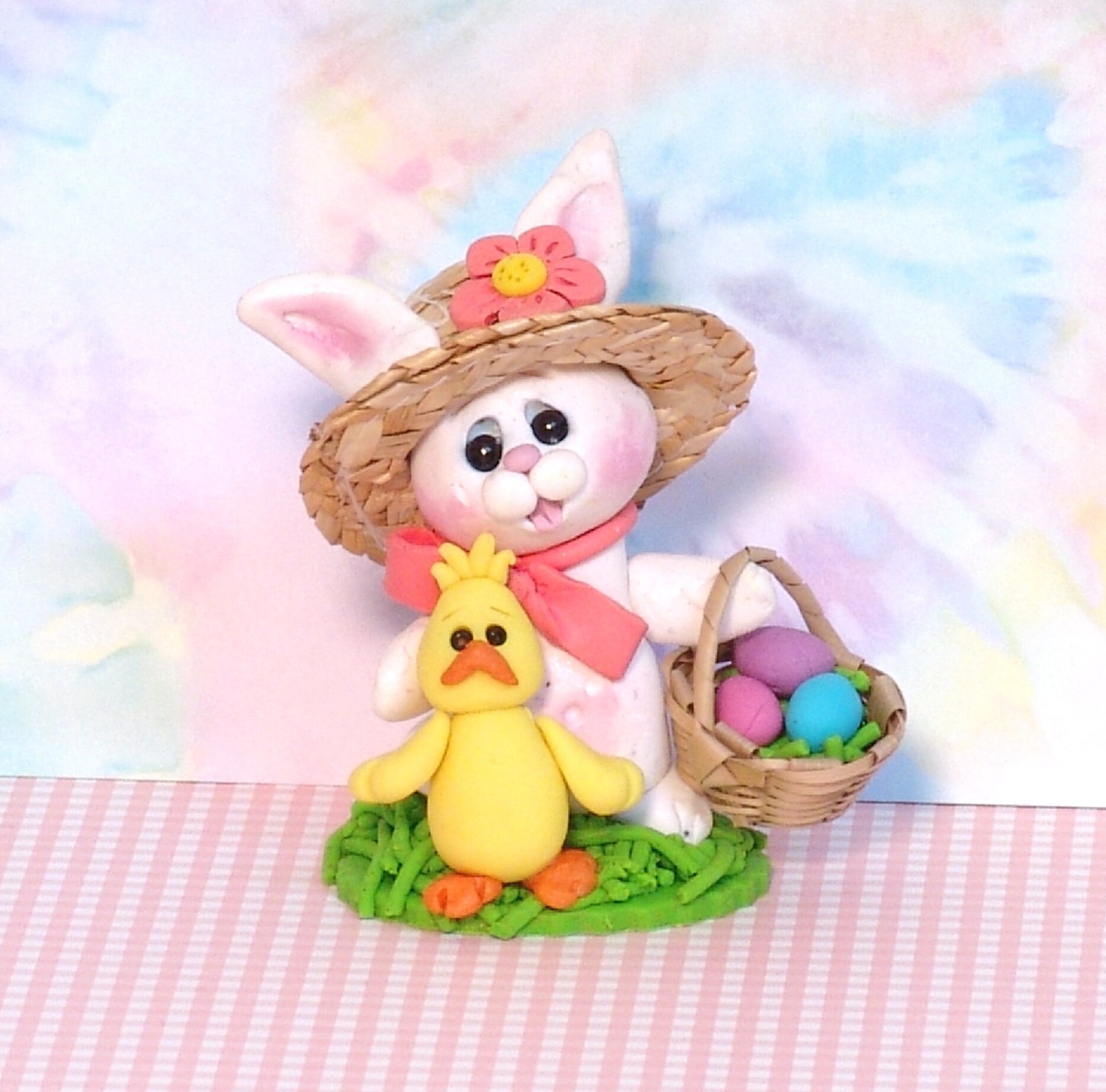 Little White Bunny with Chick and Straw Hat Figurine Handmade Polymer Clay Easter Decor