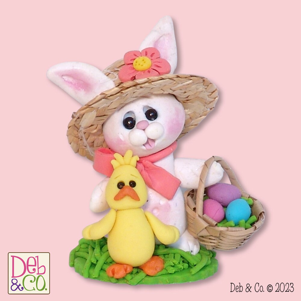 Designed by me and handmade from Polymer clay. It is extremely detailed on the front, back and sides as shown in the photos. It is a member of Deb's new Belly Bunny Collection.
