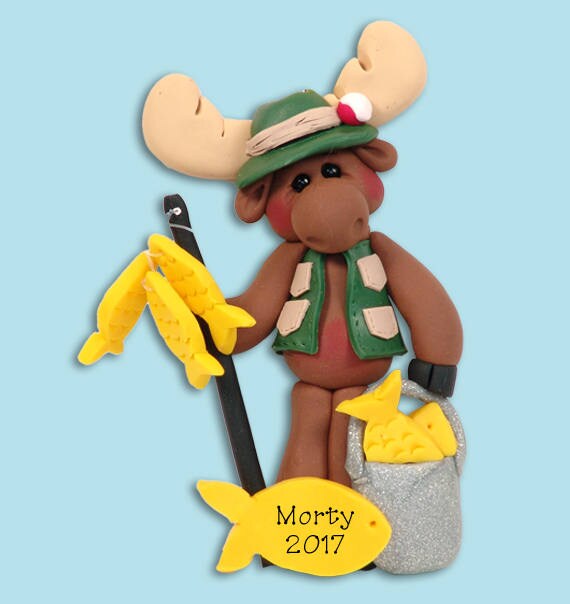 Mortimer Moose Fisherman HANDMADE Polymer Clay Personalized Christmas Ornament - Limited Edition