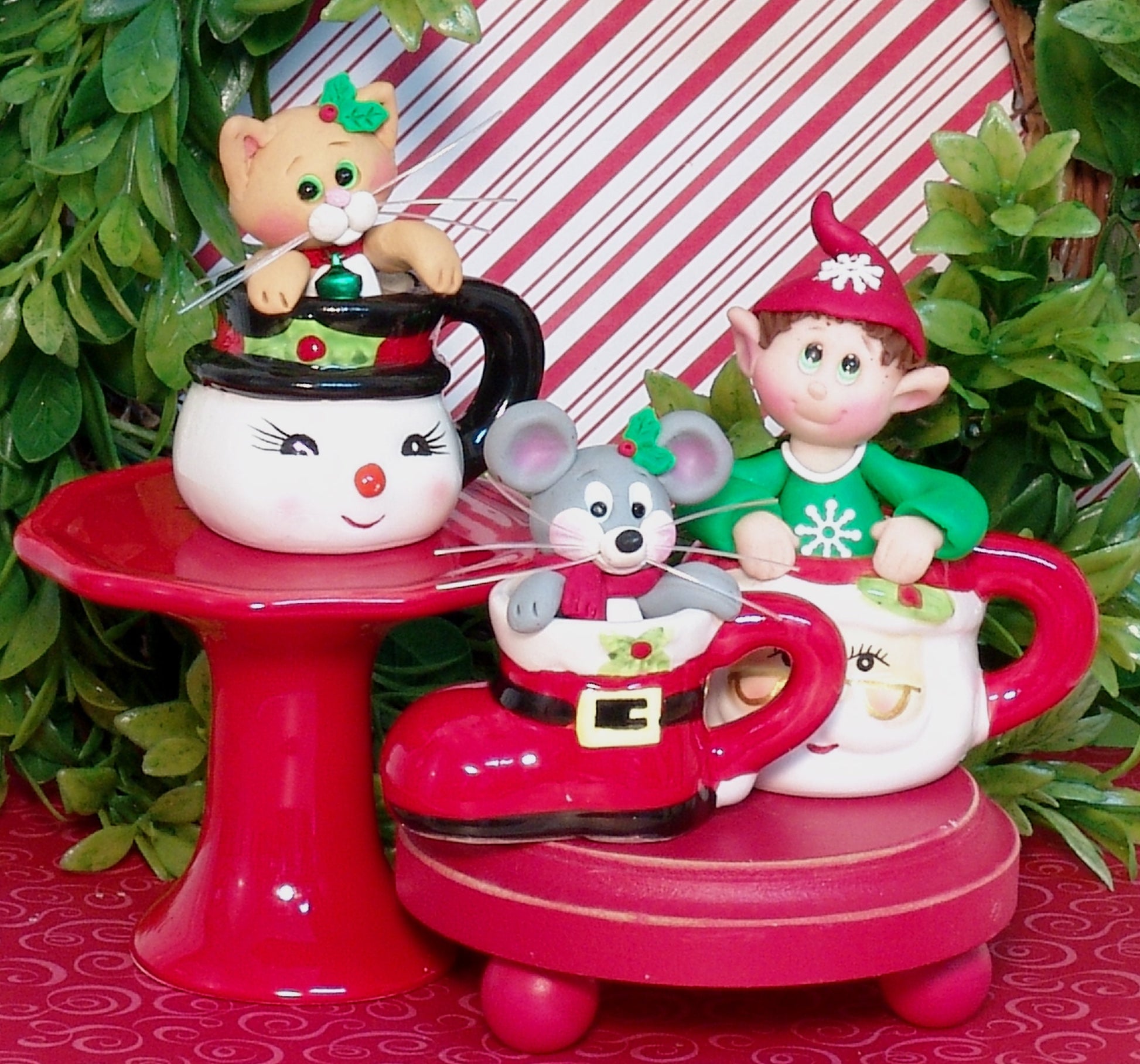 This darling little orange kitty cat is sitting in a mini snowman cup. He makes a wonderful gift for anyone who likes or collects cats. It is ideal as a Christmas decoration on a shelf, tiered tray or table.