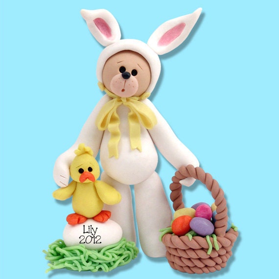 PERSONALIZED EASTER Bear in BUNNY Suit Figurine Handmade Polymer Clay