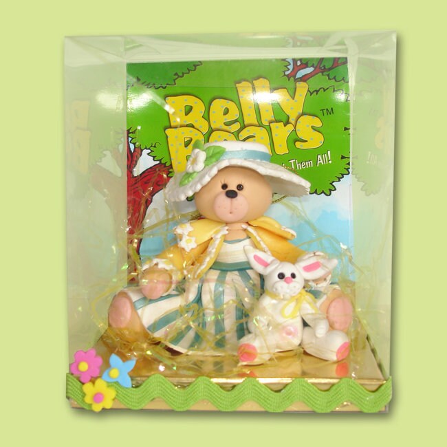 This little Belly Bear is all dressed up in her Easter best! One of my favorites, this Belly Bear is ready for Easter and she has her little bunny with her just waiting for the real one to appear and bring her Easter eggs and lots of candy. This is a figurine and has NO HOOK for hanging. It is handmade from polymer clay and designed by Debi Allison.