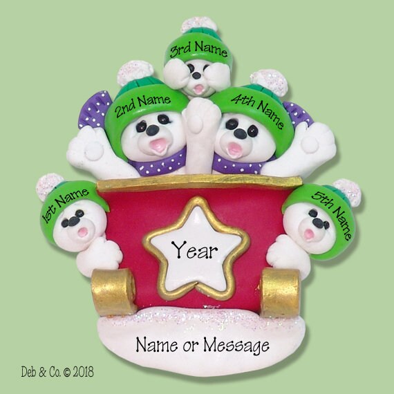 Personalized Family Ornament, Polar Bear Family of 5 inSleigh, HANDMADE Polymer Clay, Personalized Christmas Ornament, Custom Ornaments