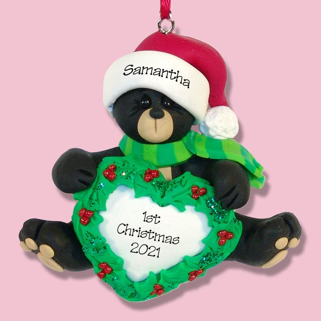Personalized Sitting Black Bear with Heart Handmade Polymer Clay Christmas Ornament , First Christmas Gift Ornament