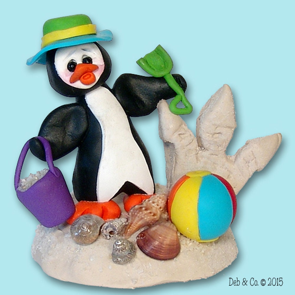 PETEY PENGUIN at The Beach Personalized Vacation Figurine Handmade Polymer Clay - Limited Edition