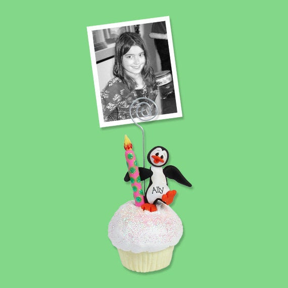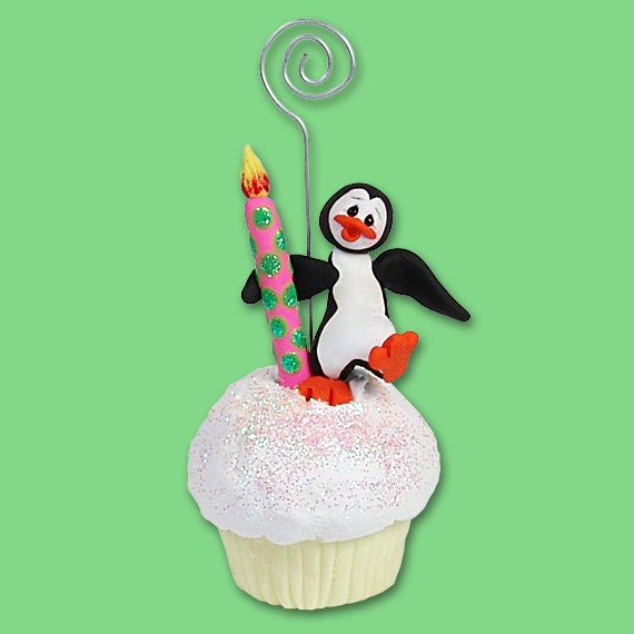 PETEY PENGUIN Birthday Cupcake Photo Holder / Place Card Holder - HANDMADE Polymer Clay