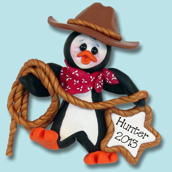 Petey Penguin Cowboy HANDMADE POLYMER Clay Ornament - Limited Edition - Personalized Christmas Ornament