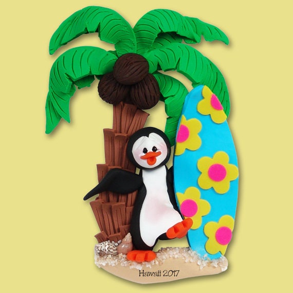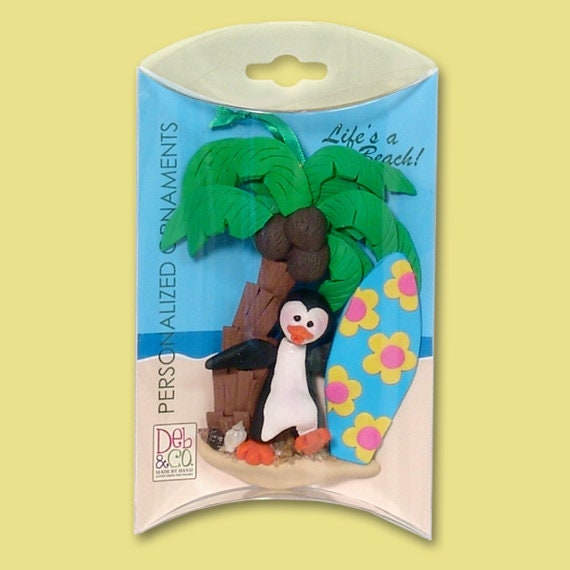 PETEY PENGUIN w/ Surfboard Personalized Vacation Ornament Handmade Polymer Clay - in Custom Gift Box