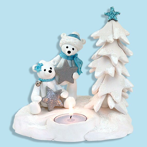 Since our Polar Bears have had such an overwhelming response we have taken our couple and set them in a wonderful winter landscape. The Polar Bears can be personalized on the stars and the year could be put on the front of the snow. Sure to "light up" your life! This Tea Light /Candle is hand made from polymer clay and lovingly designed by me.