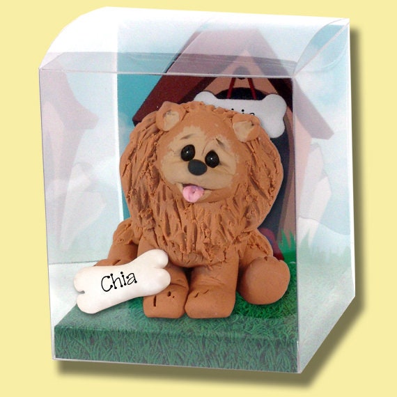 This is a darling little Pomeranian Personalized Dog Ornament Handmade from polymer clay by me, it is my first attempt at a Pomeranian and there is just this one available. He is packaged in his own little clear acrylic box with his dog house in the background.