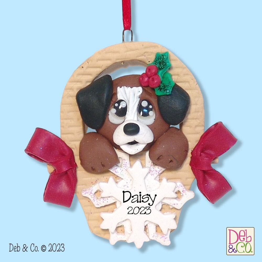 Puppy Dog in Basket HANDMADE Polymer Clay Personalized Christmas Ornament
