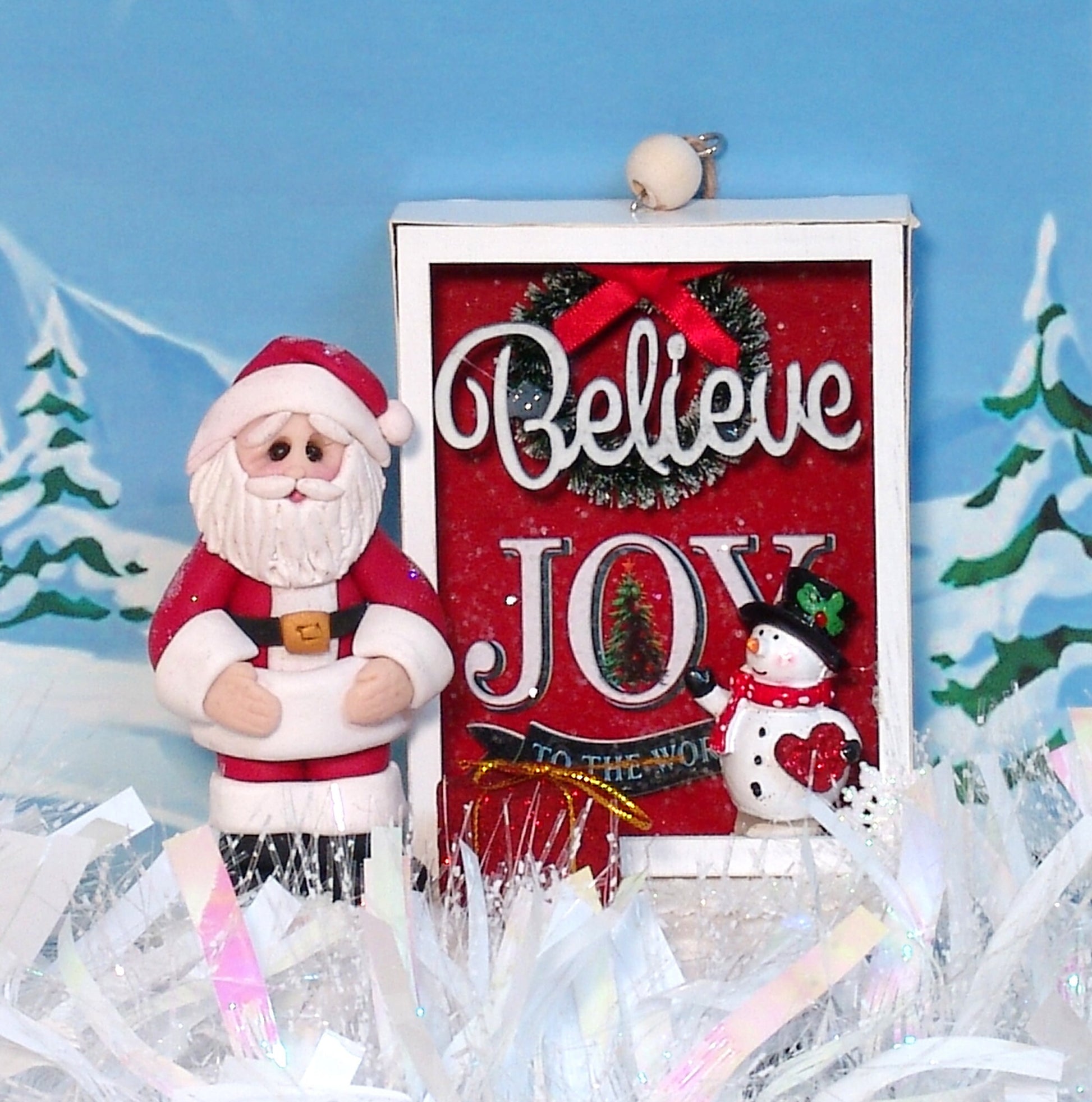 This is a darling little Santa standing beside a Christmas Plaque that says "Believe" and "Joy". It is handmade from polymer clay by me It makes a great gift for someone that has everything and loves Christmas Decor. It is a nice size and would work well on a shelf, mantel or Tiered Tray Decor.