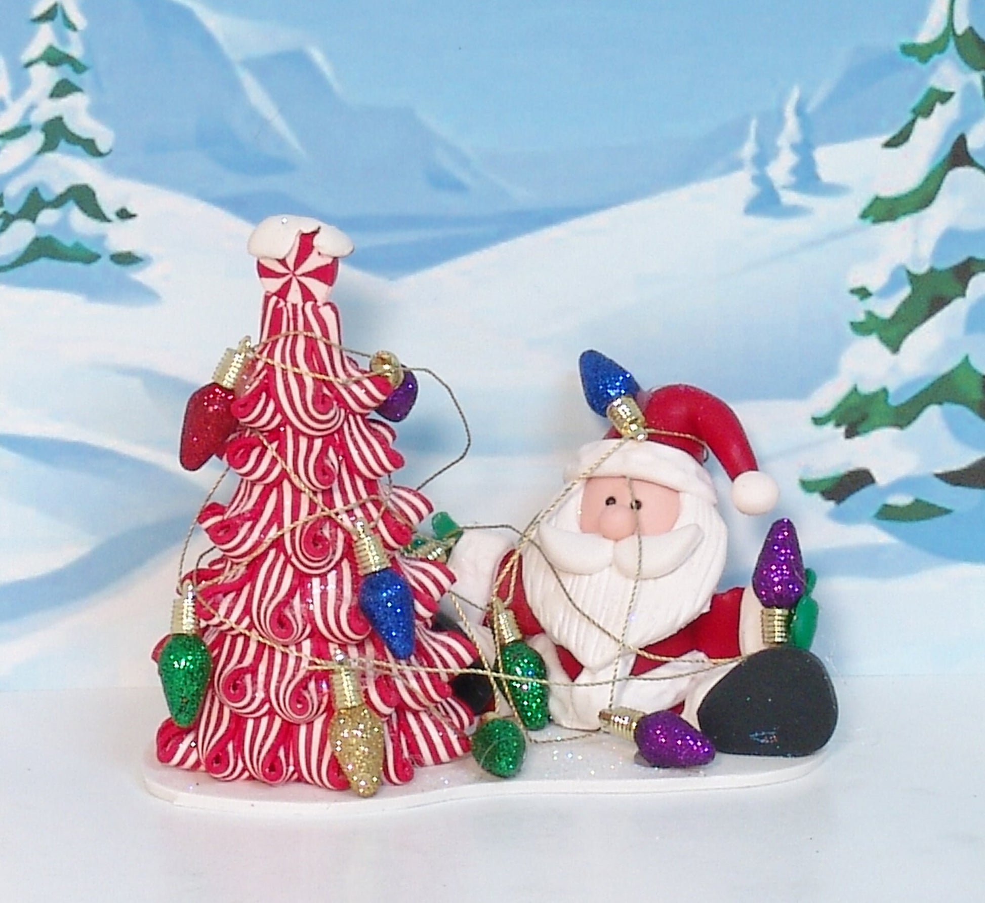 Santa Figurine with Christmas Lights and Peppermint Christmas Tree - Handmade Polymer Clay