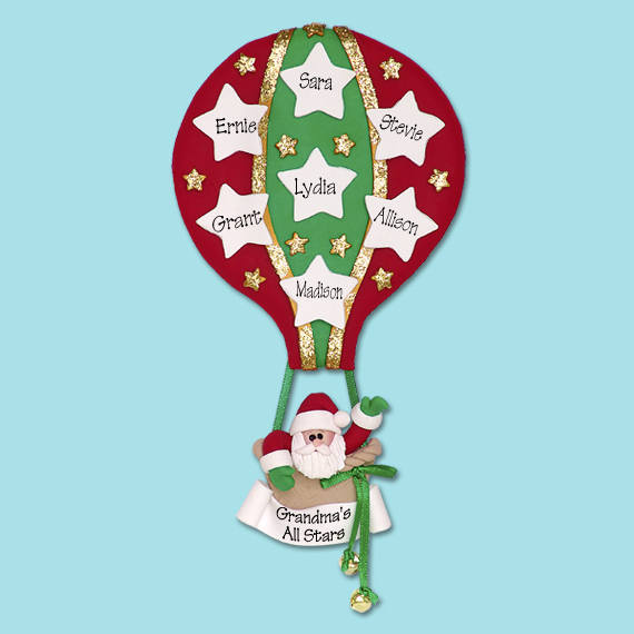 Santa HOT AIR BALLOON w/7 Stars HandmadePolymer Clay Personalized Christmas Family Ornament