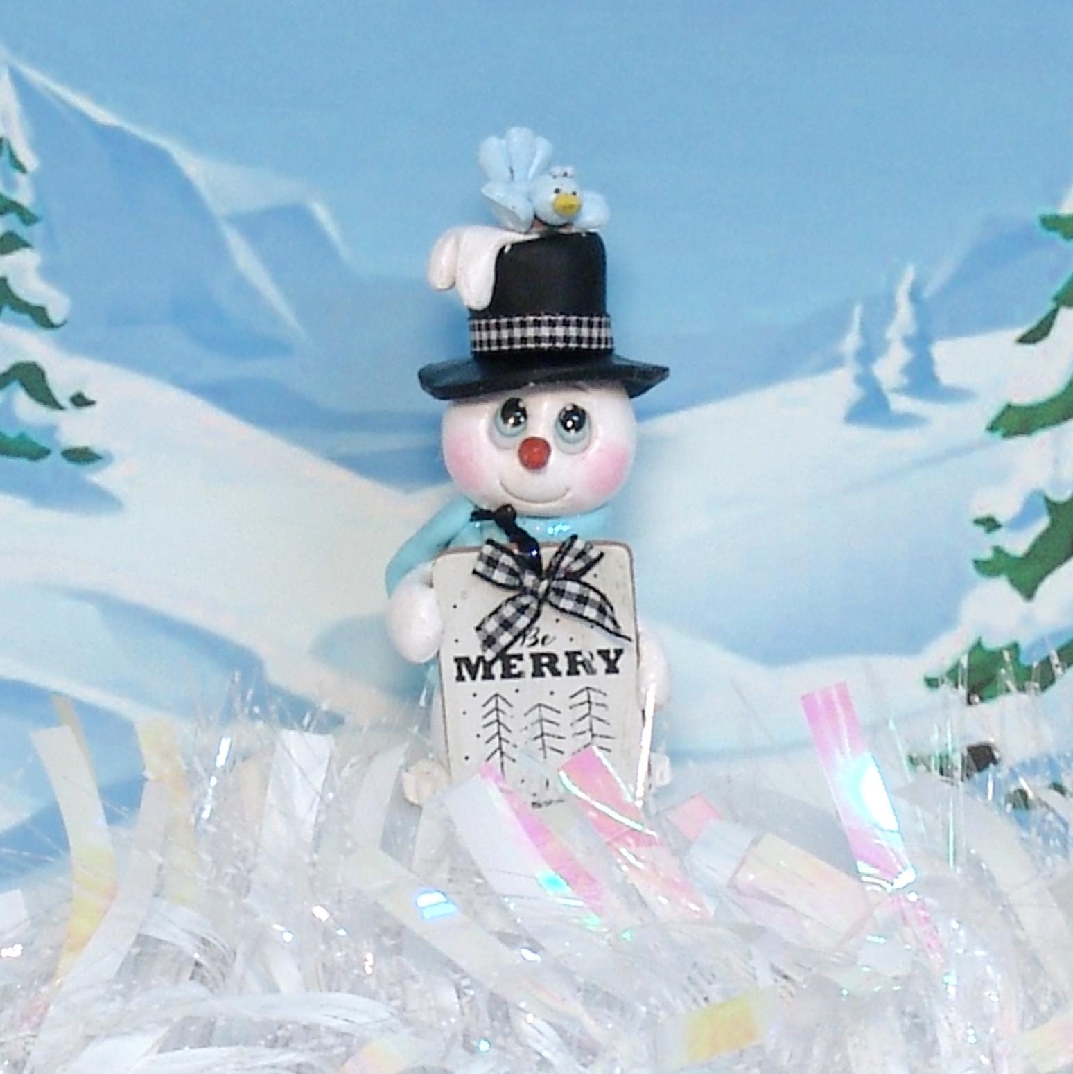 This classic design is perfect for any snowman lover. Done in pastel blue with a wooden sign that says "Merry" and a blue bird on his hat.  He has just enough glitter to catch your eye. Handmade from polymer clay and designed by me. There is NO HOOK or ribbon for hanging
