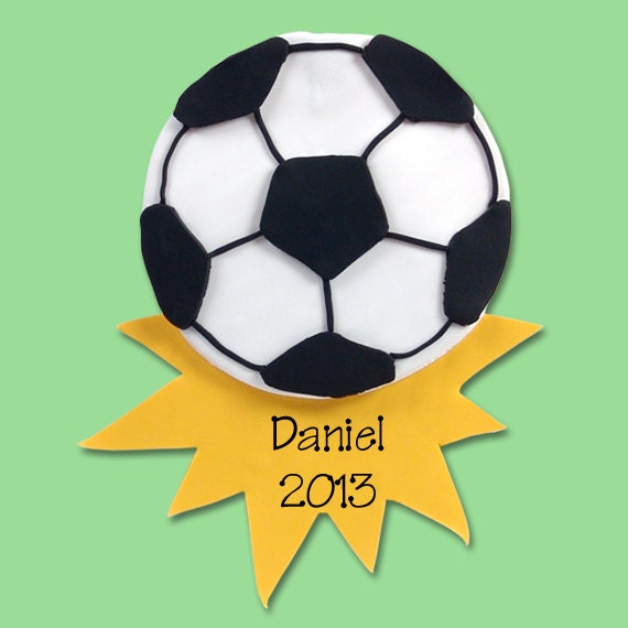This personalized soccer ball Christmas ornament is handmade from polymer clay. It has a matte finish. It measures approximately 5" high by 3.5" wide and comes with a hook and satin ribbon for hanging.