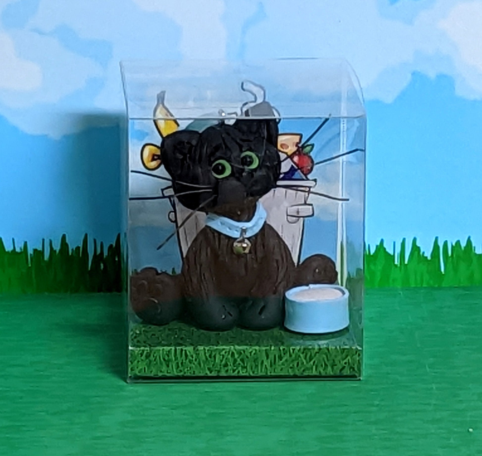 One of my newest Wacky Whiskers. We have had a lot of requests for a solid black cat so here he is! It may be easily personalized with a name on her food dish. It is packaged in it's own little clear acrylic box with a cute background that may also be personalized.