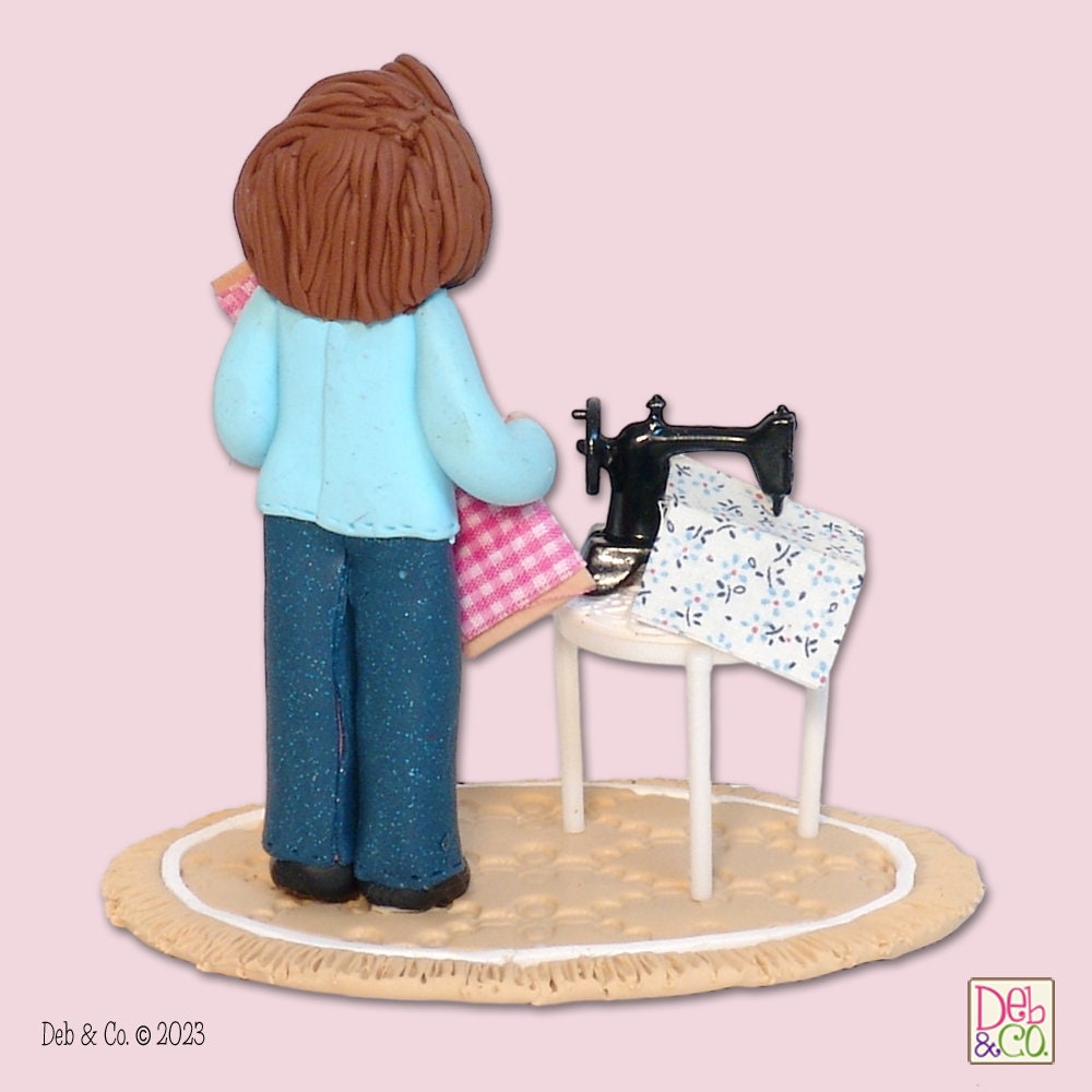 This is a 3-dimensional figurine, lovingly designed and handcrafted from polymer clay by me. Sophie is standing on a rug holding a bolt of fabric. She has a sewing table with a miniature sewing machine. The table is not attached, so this is a 2 piece set. It is also available with a little flowered personalization plaque.