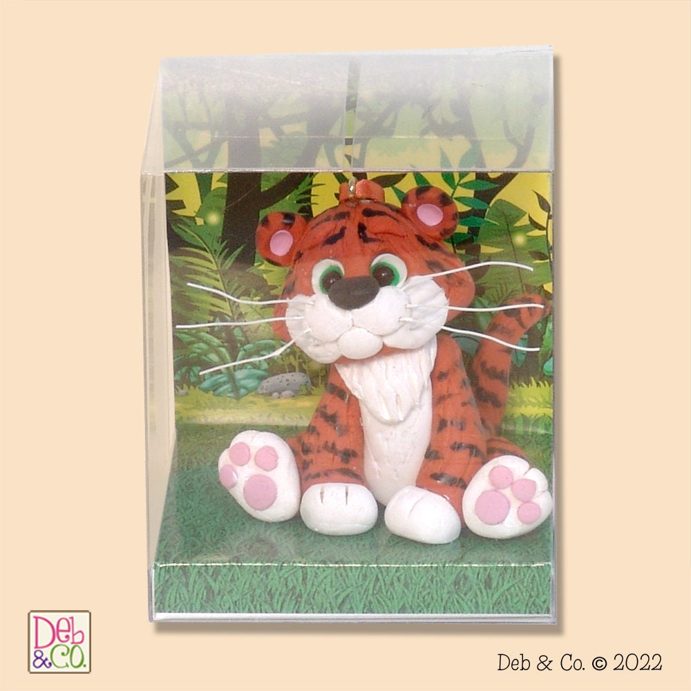 One of my newest ornaments, this is one of my renditions of a tiger. He is a 3 dimensional ornament and very detailed. The tiger cannot be personalized. He comes with a plaque that may be easily personalized with a name and year on the rock. Handmade from polymer clay by me. Comes complete with a hook and satin ribbon for hanging and is packaged in this cute little box with a jungle backdrop.