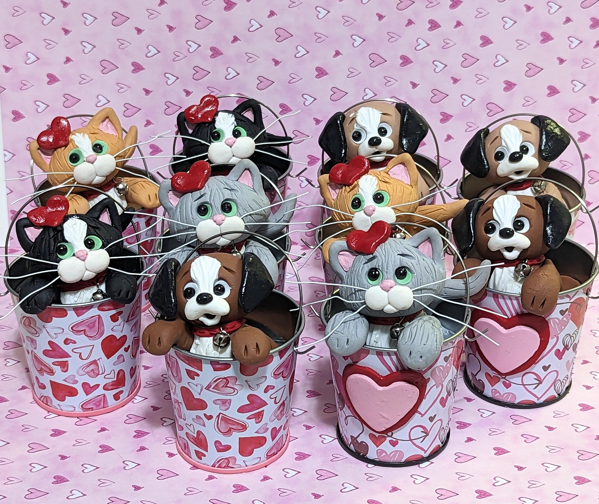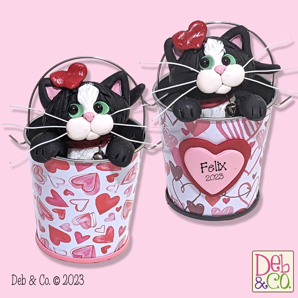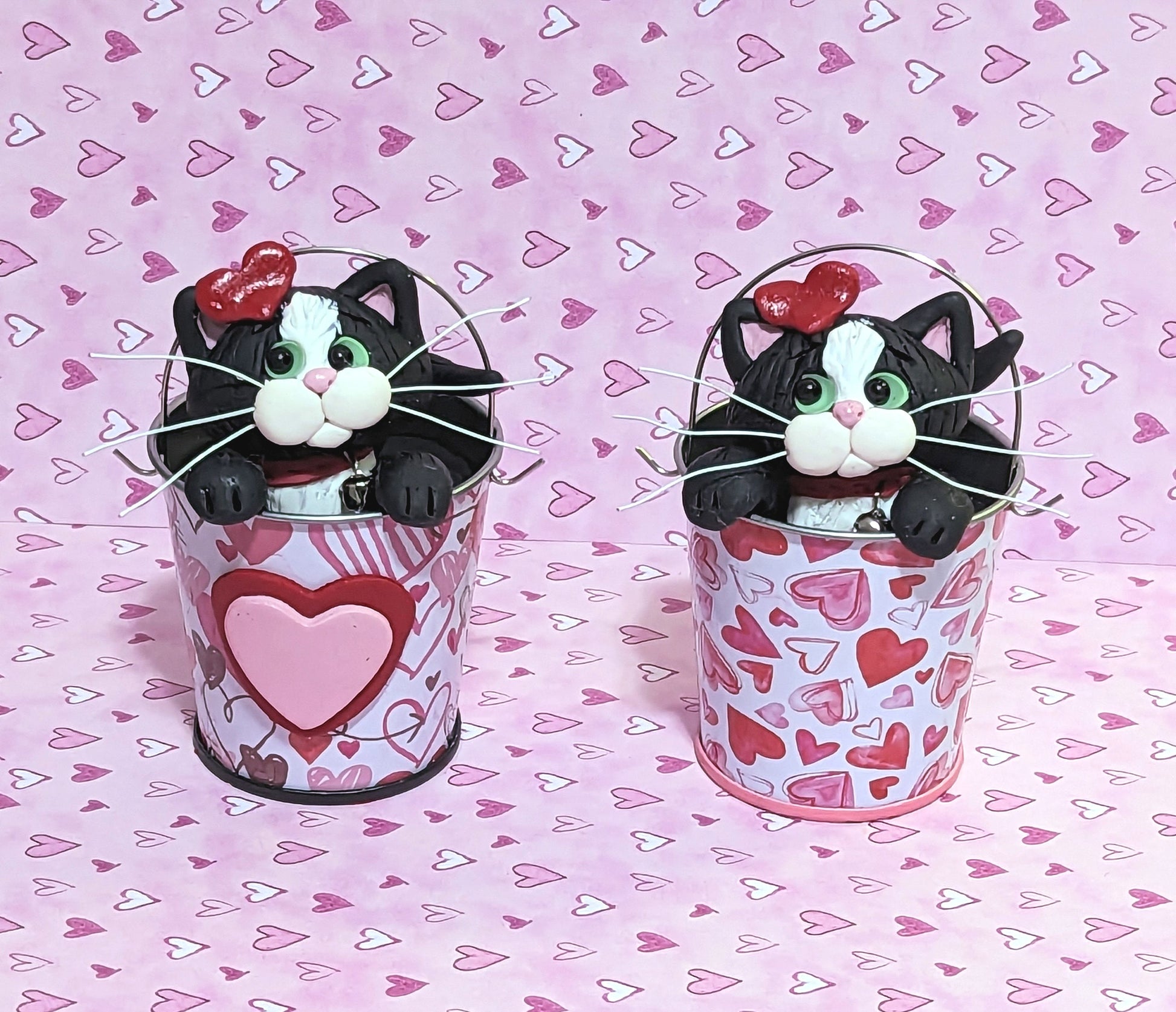 Tuxedo KITTY CATS in Valentine Bucket Handmade Polymer Clay Valentine Decor