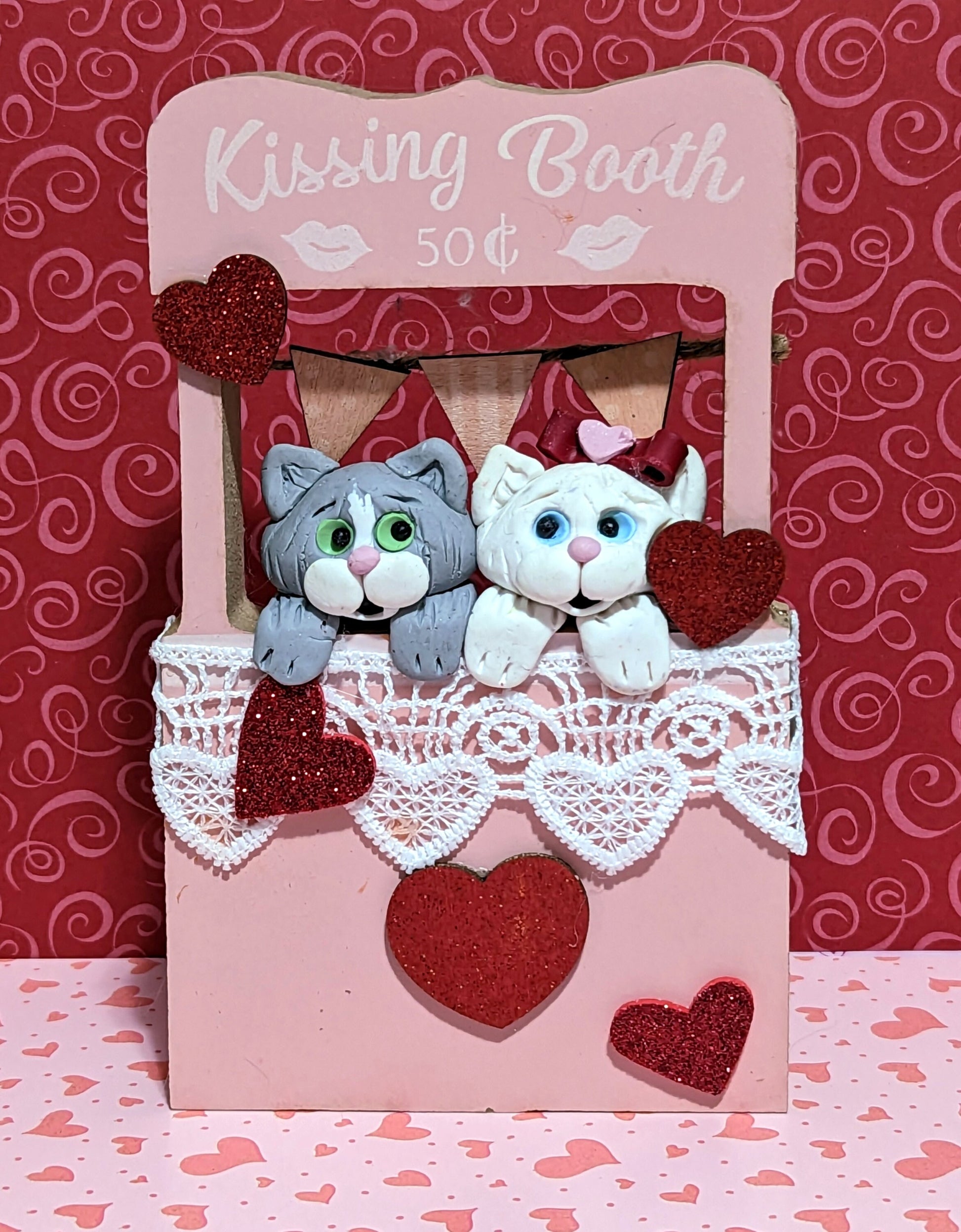 Two Kitty Cats in Kissing Booth / Handmade Polymer Clay Valentine Decoration