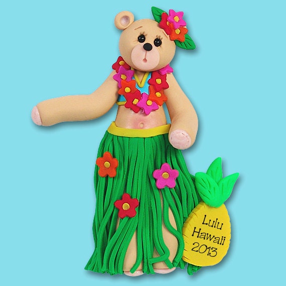 Vacation Ornaments - Hulabell Belly Bear HULA DANCER Personalized Christmas Ornaments - Handmade Polymer Clay- Hawaiian Souvenir