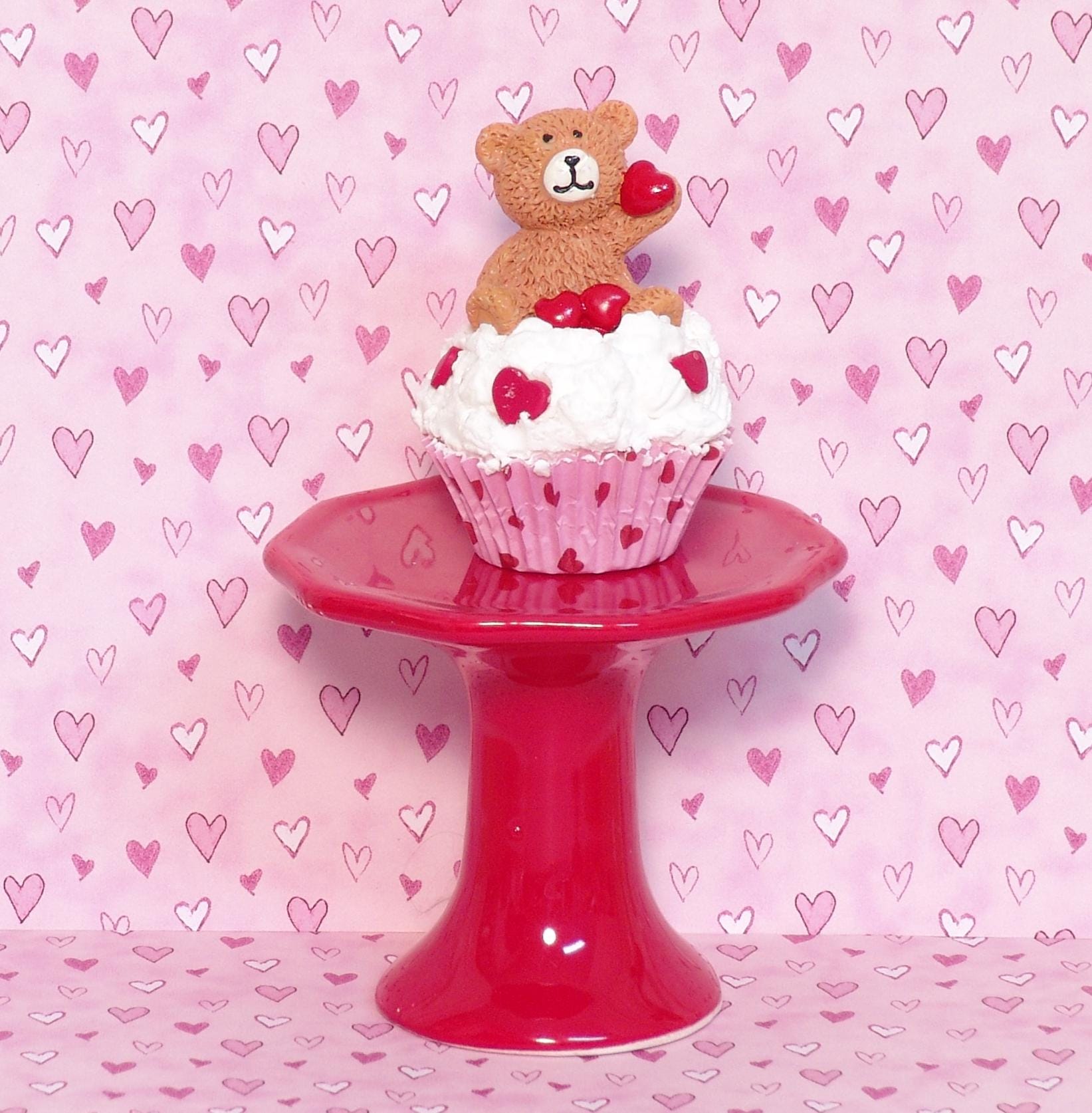 Valentine Cupcake with Bear Figurine / Handmade Polymer Clay Tiered Tray Decor