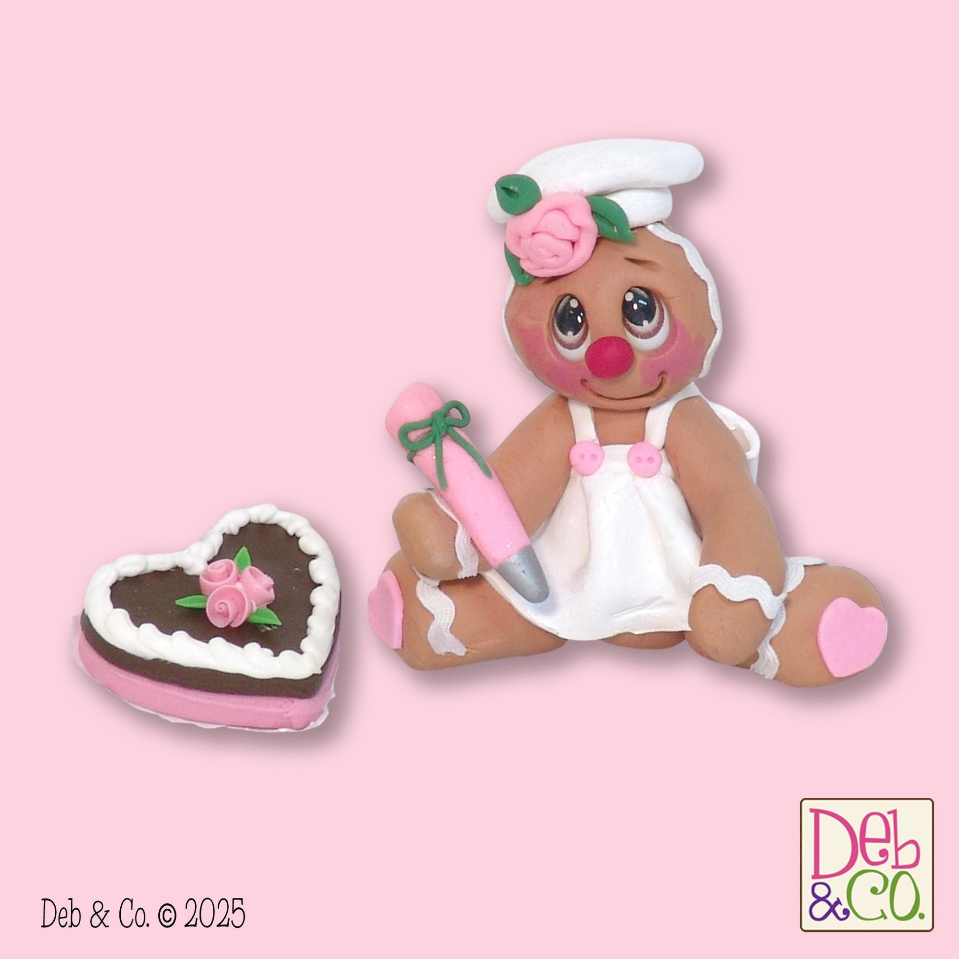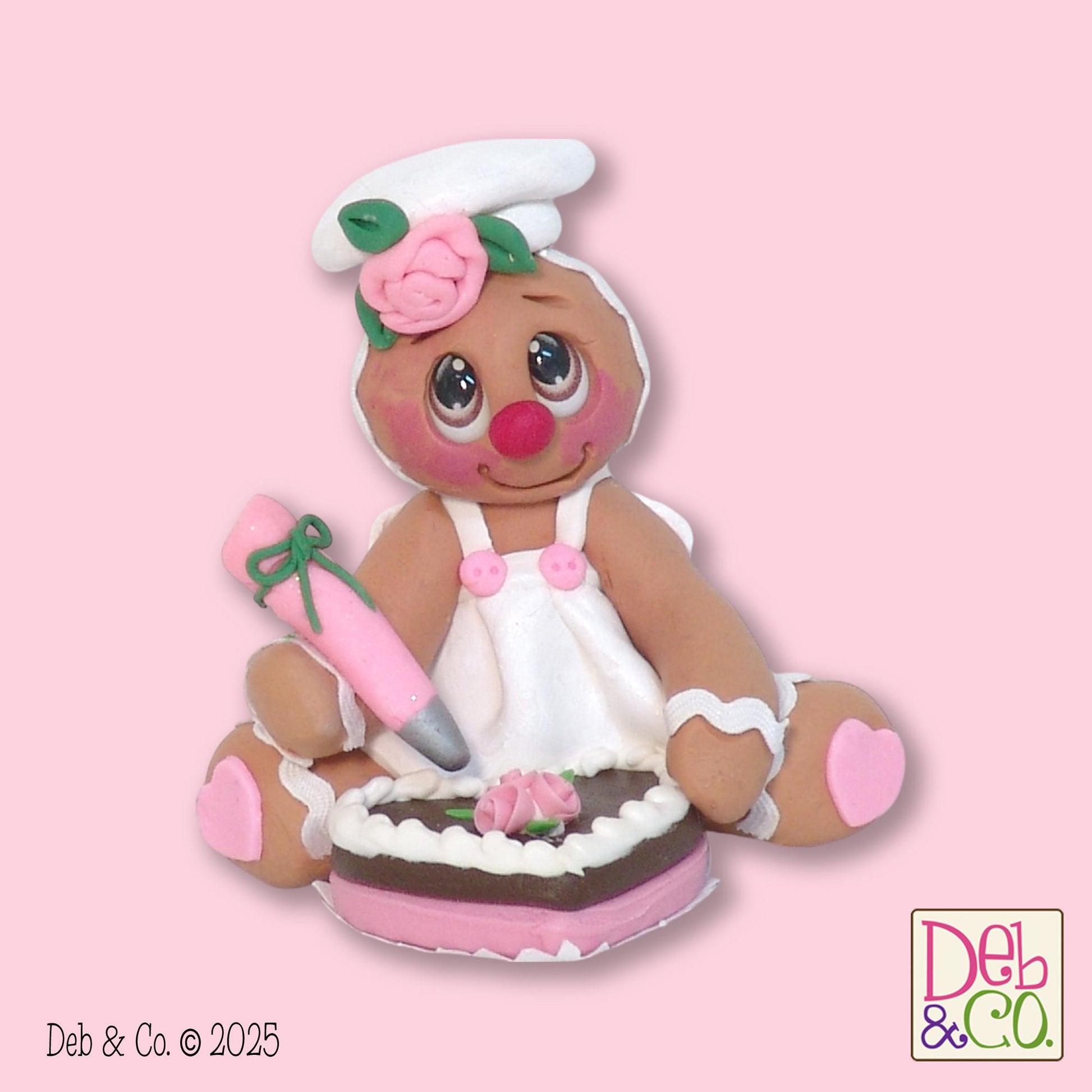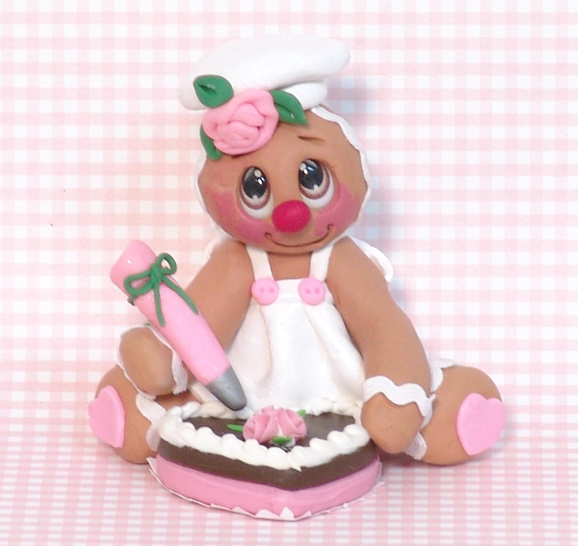 This is a cute little Gingy decorating a decorating a sweet heart cake. It is a two piece set so that you may use the pieces in other ways.