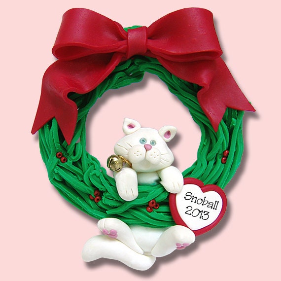 White Christmas KITTY CAT in Wreath HANDMADE Polymer Clay Personalized Christmas Ornament
