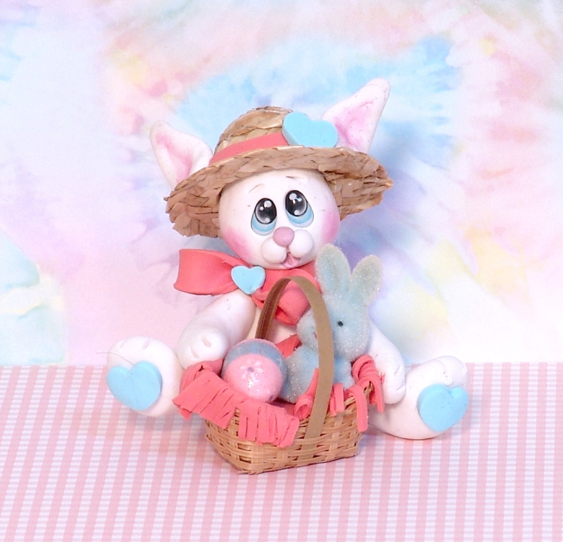 White EASTER BUNNY with Straw Hat and Basket Figurine Ornament Handmade Polymer Clay -2