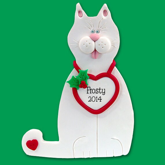 White KITTY CAT HANDMADE Polymer Clay Personalized Christmas Ornament