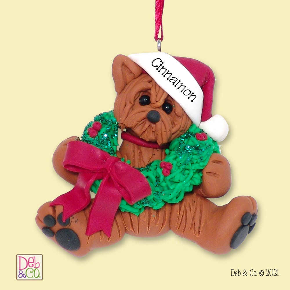 Yorkie Puppy Dog Ornament with Wreath Handmade Polymer Clay - Personalized Christmas Ornament - Limited Edition